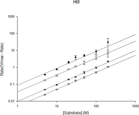 このプロットは酵素の協同性 (cooperativity) を測定するのに使用します。協同性とは酵素が高い触媒作用に達する速度ではなく、酵素の制御反応が有効であることを示す尺度です。