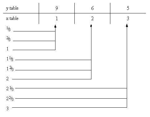 {9,6,5} に対して、3つずつの連続する値を生成するには、lookup(data(1/3,3,1/3), data(1,3), {9,6,5}) と記述します。戻り値は {9,9,9,6,6,6,5,5,5} となります。これは、x table の境界 1, 2, 3 を使って数値 1/3, 2/3, 1, 1 1/3, 1 2/3, 2, 2 1/3, 2 2/3, 3 を検索し、対応する y table の値 9, 6, 5 をこれらに割り当てたものです。