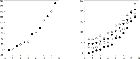 シンボルを自動的にインクリメントさせる場合、Graph Wizard で列対を選択するのと同じ要領で、曲線 (または、プロットに曲線が一つしかない場合はその点) にシンボルタイプを割り当てます。SigmaPlot は選択したスキームに従ってシンボルをインクリメントします。