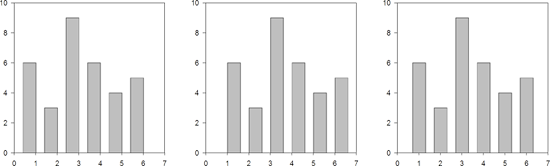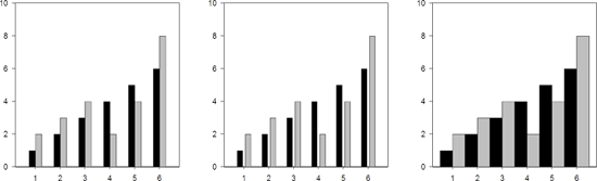 図 49. 左から順番に:グループ間隔と相対的な太さを 50% と 100% に設定した棒グラフ、どちらも 66% に設定した棒グラフ、および、どちらも 100% に設定した棒グラフの例
