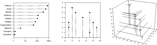 ドロップラインを使えば、データポイントと軸の値をつなげたドットプロットをはじめとする各種グラフを作成できます。ドロップラインは、2D 散布図、折れ線、折れ線/散布図にプロットされたデータポイントから軸の片方または両方に引くことができます。3D 散布図や軌道プロットでは、背面 (back plane) のいずれかまたは全てに引くことができます。ドロップラインはプロットにある全ての曲線に引くことができます。