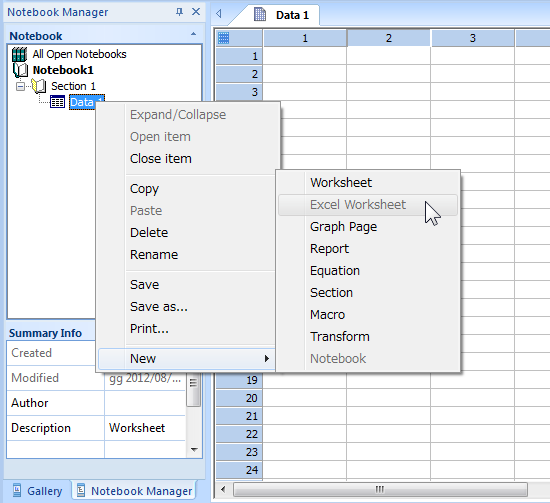 - ショートカットメニューで New をクリックして、作成するアイテムをクリックします。新規 Section またはアイテムが Notebook Manager 内に表示されます。