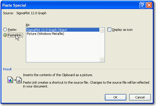 - SigmaPlot と他のアプリケーション間にリンクを作成するには、Paste Special (形式を選択して貼り付け) ダイアログボックスの Paste Link (リンク貼り付け) を選択します。OLE オブジェクトを確実に貼り付るには、Paste Special (形式を選択して貼り付け) コマンドを使用します。Paste Special (形式を選択して貼り付け) コマンドがなければ、アプリケーションが OLE をサポートしていない可能性があります。