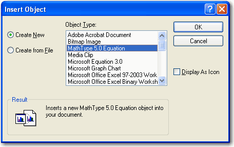 - 新規オブジェクトをアイコンとして表示するには、Insert Object (オブジェクトの挿入) ダイアログボックスで、Display As Icon (アイコンで表示) を選択します。