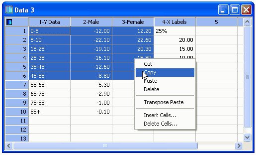 ツールバーに用意されているコマンド以外にも、右クリックして表示されるショートカットメニューを使用できます。右クリックで使用できるショートカットメニューには、Cut (切り取り) 、Copy (コピー) 、Paste (貼り付け) 、Transpose Paste (列と行を入れ替えて貼り付け) 、Insert Cells (セルの挿入) 、Delete Cells (セルの削除) があります。