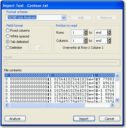 テキストファイルをインポートする場合、Import Text ダイアログボックスが表示されます。テキストファイルの表示、区切り文字を他の形式に指定する、カスタムの列幅に応じてデータファイルのモデルを形成するにはこのダイアログボックスを使用します。