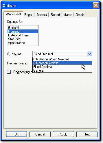 | E Notation Always | 常に科学的記数法でデータが表示されます。小数位は Decimal Places 編集ボックスで設定します。 | 12.00e+1 |