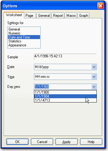 SigmaPlot では起算日 (day zero) を0から認識する点にご注意ください。起算日を 1 から始めるスプレッドシートソフト製品もありますので、その場合は、SigmaPlot の開始日を1日早く設定する必要があります。