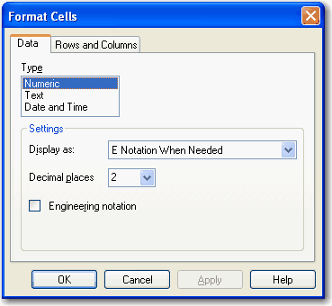 Numeric を選択すると、使用する小数点以下の桁数を設定したり、選択したワークシートの列に E notation を使用できます。