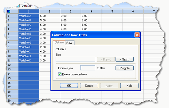- Column and Row Titles ダイアログボックスでColumn タブをクリックします。置き換えを実行する列の番号を Promote row ボックスで指定します。