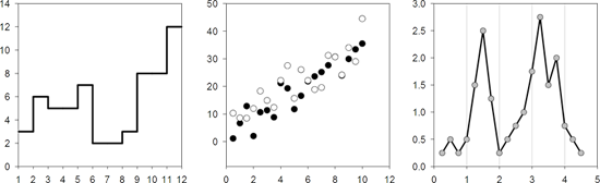 散布図 (scatter)、折れ線 (line) グラフ、折れ線/散布図 (line/scatter) では、グラフのデータをシンボル、シンボルなしのライン、シンボルとラインを使ってプロットできます。ラインの形状には、点と点を結ぶ線分 (straight segment)、スプライン、または、階段 (step) を選ぶことができます。いずれのプロットタイプにおいても、XY 両軸にドロップラインを追加でき、シンボル付きプロットについてはエラーバーを追加できます。また各曲線に対しては、信頼/予測区間を伴う線形または多項式の回帰線を描画できます。
