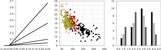 複数のプロットを作成しなくても、複数の曲線を表示することができます。複数の曲線をプロットするには、”Multiple” が付いているプロットスタイルを選択して、Graph Wizard の曲線のリストに列または列のペアを追加します。Graph Wizard 、もしくは Create Graph タブで▼を押して表示されるグラフスタイルから、複数プロットのグラフスタイルの全てのタイプを一覧することができます。