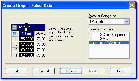 - データの選択を誤った場合は、Graph Wizard でエントリを選択しなおし、ワークシートから正しい列を選択します。リストをダブルクリックすることによって、列の割り当てをクリアすることもできます。