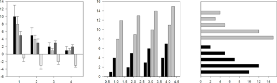 エラーバー付き、もしくはエラーバーなしのグループ化棒グラフを作成するには、Graph Wizard を使用します。エラーバー付きグループ化棒グラフを作成する場合、グラフを作成する前に、エラーバーで使う値をワークシートの列にあらかじめ用意しておく必要があります。エラーバーにするワークシートの列は、グラフ作成の際に指定します。