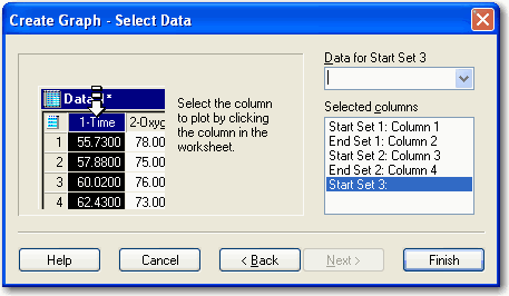 グラフを作成する前に、ポインタでデータをドラッグして、プロットするワークシートの列を選択しておきます。詳細は、