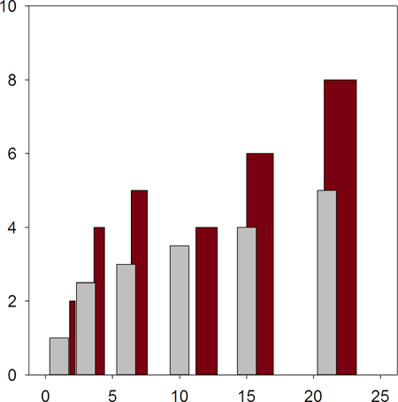 SigmaPlot では、別プロットとの棒の間隔は自動的には設定されません。ただし、欠損または空のデータを含む列(複数も可)を使用してデータ列(複数も可)をグループ化することにより、マニュアルで棒の間隔を設定できます。これにより、NULL 値の棒グループを作成し、他の棒に対して間隔をあけることができます。プロットする列を選択する際には、棒がオーバーラップしないように、各プロットに対して欠損値の列を異なる順序で選択します。