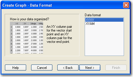 | ※ Note:XYAM 形式を使用して、かつベクトル規模が X,Y 座標よりもだいぶ大きかったり小さかったりする場合は、データの規模をスケールする必要があるかもしれません。はっきりと表示するために、ベクトルは十分な大きさであるべきですが、オーバーラップしないためには X,Y 座標内で間隔をとるに十分な小ささであるべきです。 |