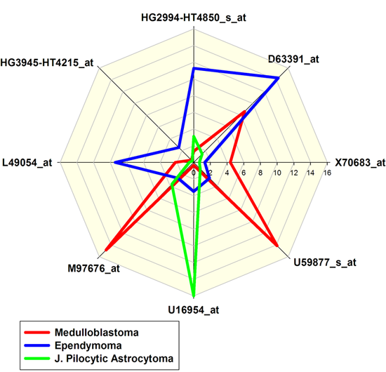レーダーグラフの具体例として、遺伝子発現特性 (gene expression signatures) と小児脳腫瘍 (childhood brain cancer) のタイプの関係をあらわしたグラフを紹介します。以下に示す結果は、3つのデータセットからなる折れ線型のレーダーグラフです。予測される遺伝子とその発現量を各脳腫瘍ごとに決定するデータマイニング技術を使って生成されました。予測因子になることが分かったのは8つの遺伝子です。この遺伝子発現特性をあらわすひとつの方法がレーダーグラフを使うことです。8つの異なる遺伝子の遺伝子発現量がこのレーダーグラフの変数となります。以下のレーダープロットでは放射状の8つの軸としてそれらが表示されています。