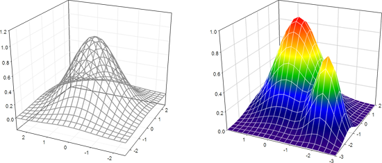メッシュプロット (3D Mesh) は、メッシュを使って 3D データを連続した表面としてグラフ化します。メッシュの線 (line)、カラー (color)、透明度 (transparency) を変更したり、シェーディングの光源を有効にするには、Graph Properties を使用します。