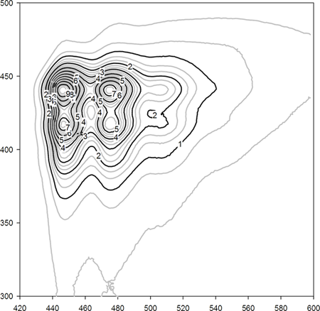 等高線グラフ (Contour graph) と色づけ等高線グラフ (filled contour graph) は、XYZ 座標系の 3D データのうち、Z データ (垂直線) を指定した Z 間隔の線でプロットするものです。データ形式に Many Z を使用する場合は、ワークシートの列番号が X 値に、行番号が Y 値になります。XYZ Triple データを扱う場合は、メッシュデータに再フォーマットする必要があります。詳しくは、3D データのスムージング をご覧ください。