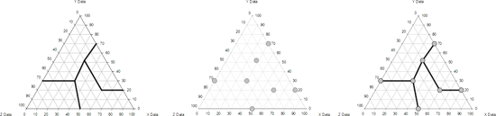 三角グラフ (Ternary graph) は、XYZ 座標系に3変数の合計が 100% または 1 になるようデータをプロットするものです。使用する変数は、一般に3成分の構成比を正規化 (normalize) したもので、通常は正三角形の3軸上にプロットします。トライアングル・プロット (triangle plot) とも一般に呼ばれています。