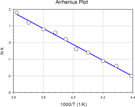 信頼性調査のグラフを作成する場合、研究者はよく逆数スケールを用います。例えば、温度が上昇するほど劣化が進むという理論があります。このケースのプロットでは、x軸に温度の逆数 (1/T (1/mK)) を、y軸に対数 (ln k) を使います。プロットにあてはめた直線の傾きは、研究で求めた化学反応 (すなわち、破損につながる反応) の活性化率です。