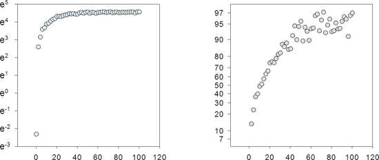 自然対数の間隔は、e の累乗ごとに設定されます。ロジットの目盛りは、7, 10 で始まり、その後 90 までは 10 間隔、その後 95 と 97 になります。