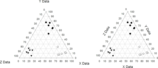 三角グラフの軸のタイトルは、頂点の位置、または、軸幅の方向に沿って配置することができます。位置を回転させて軸と平行にすることも可能です。