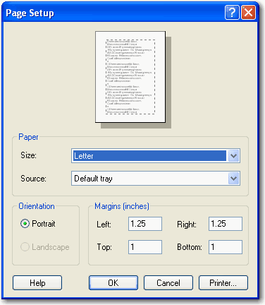 レポートの余白 (Mergin)、用紙の方向 (Orientation)、サイズ、給紙方法 (Source) を設定するには、Page Setup ダイアログボックスを使用します。