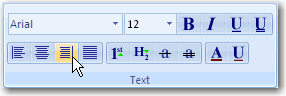 - 段落の位置揃えを設定するには、Text グループから Align Left (左揃え)、Align Center (中央揃え)、Align Right (右揃え) および Justify (両端揃え) を使用します。