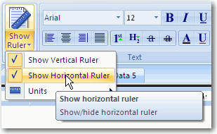 - Report タブを指定し、Ruler グループから Show Ruler ドロップダウンリストをクリックします。