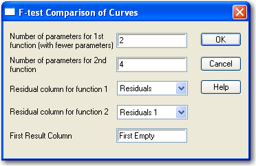 はじめに単純な方程式を、次に複雑な方程式をあてはめると、マクロにより F-test Comparison of Curves ダイアログボックスのすべてのオプションが選択されます。