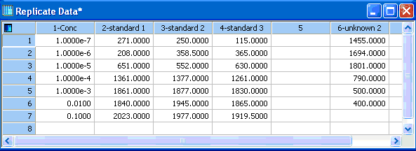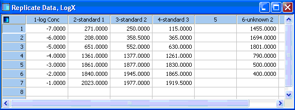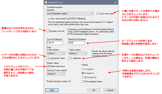 各 X 値に対して複数の測定値がある場合は、Standard Curve ダイアログボックスで Y replicates を選択し Last Y replicate column ドロップダウンリストから列を選択します。Y replicate 列は X データのすぐ右から開始しなければなりません。