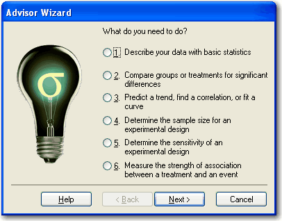 傾向の予測、相関関係の検出、または、曲線のあてはめを行う (Predict a trend, find a correlation, or fit a curve)。単一または複数の独立変数をもとに、従属変数を予測する回帰を使用したい場合、または、2変数間の関連性の強さを相関係数で説明したい場合は、このオプションを選択します。例えば、ある動物の体重からその平均カロリー摂取量を予測できるかどうかを調べたい場合は、このオプションを選択します。Next をクリックします。お持ちのデータがどのような方法で測定されたかが質問されます。詳細は、2. データはどのように測定されていますか? をご覧ください。