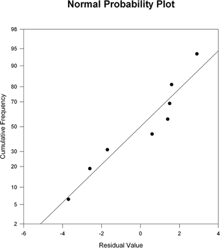 一標本 t 検定の確率プロットでは、生の残差の度数がプロットされます。詳しくは、Normal Probability Plot をご覧ください。