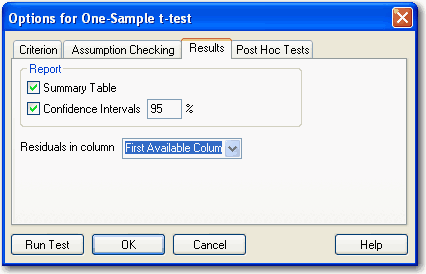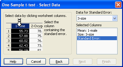 Selected Columns リストに別のワークシート列を割り当てたい場合には、ワークシートで直接その列を選択するか、Data for Data ドロップダウンリストからその列を選択します。Selected Columns リストの一行目に割り当てられるのは最初に選択した列で、以後同様に列を選択するごとにリストの2行目以降に割り当てられてゆきます。各行には、選択した列のタイトルが表示されます。要約統計データの場合は、3つの列を選択することになります。 One-Sample t-test の