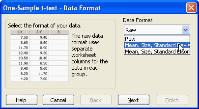 Data Format ドロップダウンリストから該当するデータフォーマットを選択します。詳しくは、一標本 t 検定のデータを配置する をご覧ください。