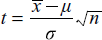 母集団の無作為抽出によって帰無仮説が真であると仮定すると、この量によって、自由度 n – 1 のスチューデントの中心 T 分布となる確率変数 T が定まります。この検定の (両側:two-sided) P 値は、 P(|T| > |t|) として計算します。ここで、 P は T に関する確率分布をあらわします。その後、指定した有意水準 α と P 値を比較します。もし、この値が σ より小さければ、標本集団の平均値と μ の間に有意な差があることになります。