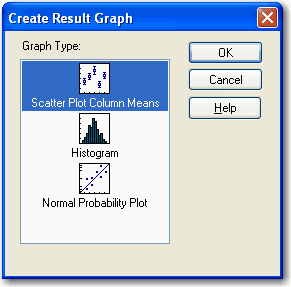 Report タブで、Result Graphs グループにある Create Result Graph をクリックします。Create Result Graph ダイアログボックスが表示され、その中に One-Sample t-Test の結果で利用できるグラフのタイプが表示されます。 図 4.5 One-Sample t-test Report の
