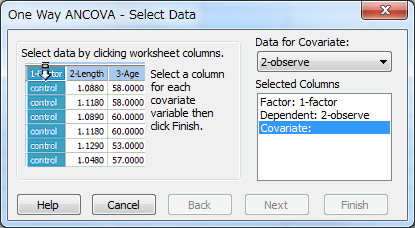 SigmaStat グループにある Tests ドロップダウンリストから次を選択します:Compare Many Groups > One Way ANCOVA検定ウィザードの One Way ANCOVA — Select Data パネルが表示されます。 One Way ANCOVA — Select Data
