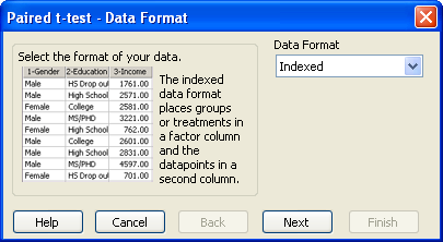 Data Format の選択を指定する Paired t-test — Data Format パネル