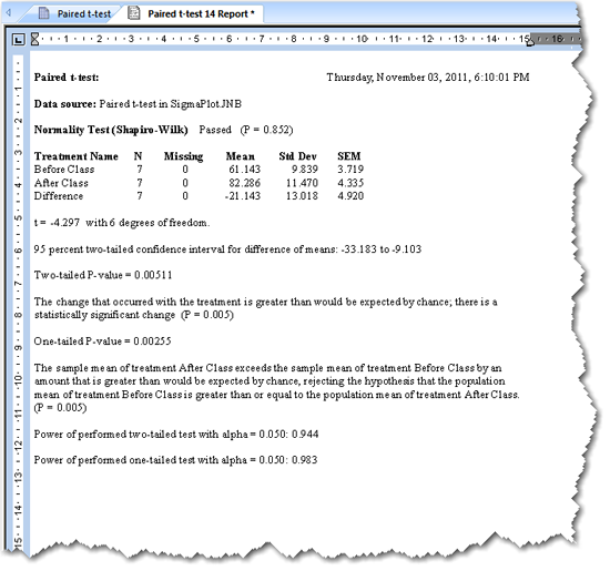 対応のある t 検定のレポートには、t 統計量、自由度、および、この検定の P 値が表示されます。レポートに表示されるその他の結果は、Options for Paired t-test での選択に依存します。