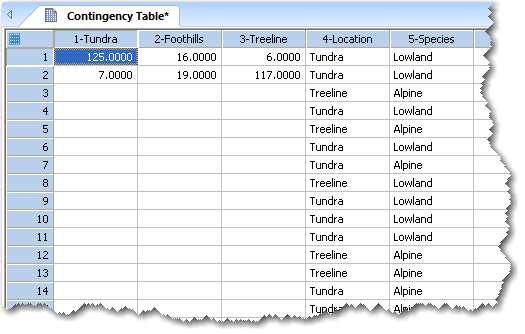 Tabulated Data :表形式のデータは、観測数を分割表の各セルに配置してあらわしたものです。ワークシートの行と列は、それぞれ群とカテゴリに対応します。観測数は整数である必要があります。なお、群とカテゴリに対応する行列の並びと配置は、重要ではない点に注意してください。カテゴリに行を、群に列を使っても、その逆を使ってもかまいません。