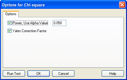 Yates Correction:イェーツの補正を使って χ2 を補正します。これによって、2 x 2 分割表の P 値が実際の χ2 分布を反映するように精度を高めます。イェーツの補正を有効にするには、Options for Chi-Square ダイアログボックスで指定しますが、適用できるのは 2 x 2 分割表のみとなります。