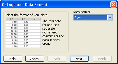 Data Format ドロップダウンリストから適切なデータフォーマットを選択します。分割表のデータを検定する場合は、Tabulated を選択します。お持ちのデータが生データの形式で配置されている場合は Raw を選択します。詳しくは、カイ二乗検定のデータを配置するをご覧ください。 データフォーマットの選択を指示する Chi-Square — Data Format ダイアログ