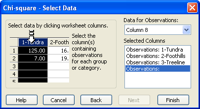 Selected Columns リストに別のワークシート列を割り当てたい場合には、ワークシートで直接その列を選択するか、Data for Observations または Data for Category ドロップダウンリストからその列を選択します。最初に選択した列は、Selected Columns リストの Observation または Category 行に割り当てられ、二番目以降の列は それぞれ次の行に割り当てられます。各行には、選択した列のタイトルが表示されます。生データの場合、ワークシートの列を2つ選択するよう指示されます。表形式のデータの場合は、64 列を上限とする列を選択するよう指示されます。