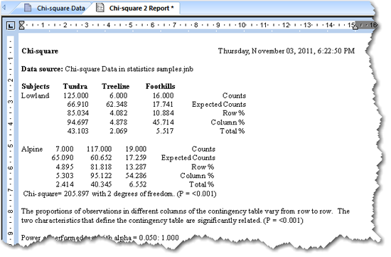 カイ二乗検定の検出力 (Power)、すなわち感度は、群間に真の差がある場合、その検定で群間の差を検出できる確率です。検出力が 1 に近づくほど、その検定の感度は高くなります。カイ二乗の検出力は、サンプルサイズと測定された各標本の割合によって影響を受けます。この結果は、Options for Chi-Square ダイアログボックスで無効にしない限り表示されます。