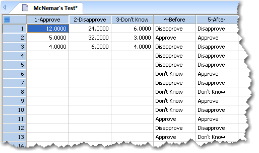 上記ワークシートの列1から3までが表形式、列4から5までが観測した生データになります。マクニマーの検定では、列と行が同じ数の表となるデータが必要です。この場合は、 3 x 3 表となります。