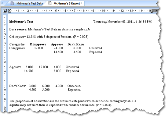 マクニマーの検定のレポートには、分割表データのサマリー、その分布を元に算出された χ2 統計量、および P 値が一覧で表示されます。
