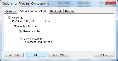 Normality の検定:SigmaPlot の主成分分析では、母集団の分布の正規性検定に Henze-Zinkler または Mardia’s test for